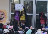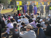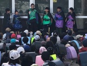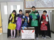 児童会が扮装するオアシスレンジャーがまたまた登場しました。今回は「赤い羽根共同募金」について呼びかけてくれました。児童玄関では、早朝より募金箱を持ちながら、元気な声が響いていました。
