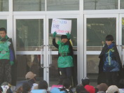 最近、登場が多いオアシスレンジャーですが、今回は「書き損じはがき」の募集とあいさつ運動の強化期間についてのお知らせをしてくれました。登場回数が増えるたびに、オアシスレンジャーに対する拍手が大きくなってきています。