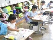 1年生では、図工の時間に「すてきなTシャツをつくろう」と、画用紙に書かれたTシャツの絵に自分で考えた色を塗っていました。子どもたちは、筆の持ち方や絵具の使い方などを先生に教わりながら、ていねいに筆を動かしていました。