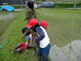 田んぼに「光」の文字が浮き上がるように田植えをしました。「光」は5年生の発案で「みんなが光輝くように」という意味があるそうです。