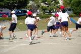 真ん中に置いてある15本の棒を、赤白各5・6名のグループで取り合うゲームです。練習ではいつも大差をつけて勝っていた赤組でしたが、今日は1本差でなんとか勝ちました。