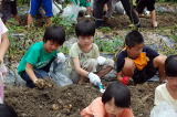 国津小学校では、いつもお世話になっている竹本さんと宅見さんの協力のもと「自然農園おりと」で、全校児童がじゃがいも掘りをさせていただきました。