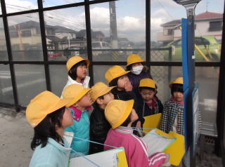 つつじが丘の回転所では、自分たちが乗るバスはどれか、何時にバスに乗るかを時刻表を見ながら、