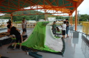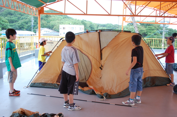 午後4時30分ごろ御座白浜パールキャンプ場に到着しました。テントを張る予定にしていましたが小雨のため、テントを張ることができませんでした。しかし、キャンプ場の方と相談して、2階の展望デッキに張らせてもらうことになりました。1度練習していたけれども、なかなかうまくいかずみんなで苦戦しながらなんとか張ることができました。そして、夜にはみんなでテントの中でゆっくり休みました。
