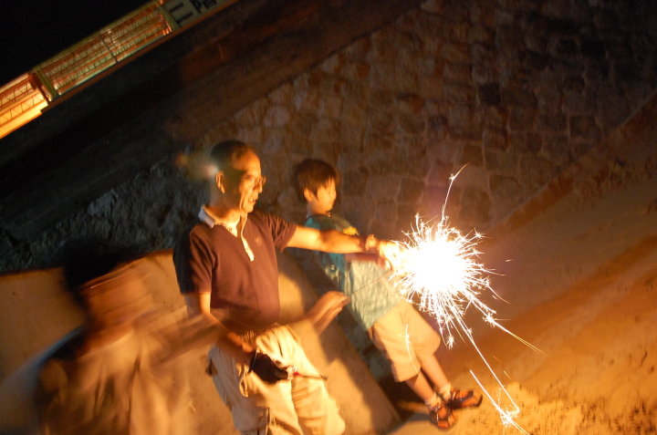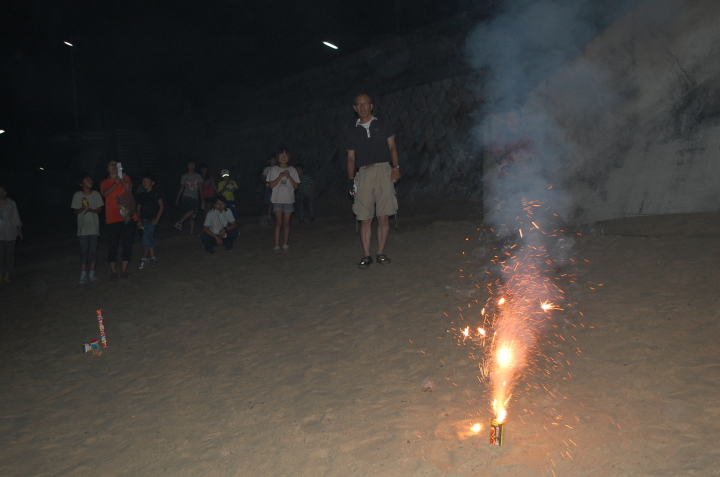 夕食の後みんなで海岸に出かけて、花火をしました。かわいらしい線香花火や打ち上げ花火も楽しみました。特に、打ち上げ花火は校長先生がすべて火をつけてくれました。きれいな花火が夜空にうちあがりました。打ち上がる度に歓声に包まれました。