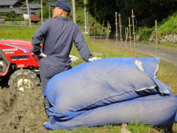 | 田んぼの水分を取り除くために、籾殻(もみがら)を蒔きました。全部で6袋くらい蒔きました。 | |