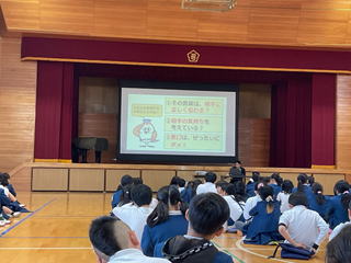 ゲストティーチャーとして、名張警察署員の方に来ていただき、体育館で資料を見せながら授業をしていただきました。