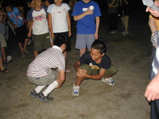 ![]() 曽爾キャンプで5・6年生が企画したゲーム(名前を忘れてしまいました!)「座っておしくらまんじゅう?」を再現し、皆に紹介。 |