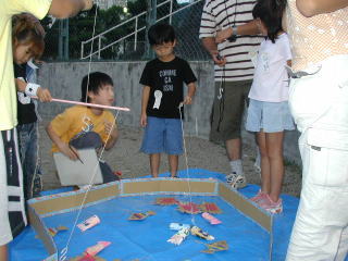 前半最後のイベント「魚釣り」では、沢山釣った子もいて大喜び。17:00ごろまで延長して大漁で大満足。テントをお父さんたちに手伝ってもらい、みんなではりました。17:30からお待ちかねのバーベQに舌鼓を打ち、夜の部へ。 |