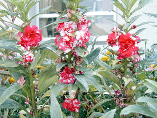 | 夏休みで子どもたちが居ない学校の校舎の玄関前には、ひっそりと綺麗な花々が咲いています。 |