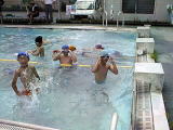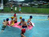 指導水泳終了後の、水遊びの様子。くつろいだ表情をご覧下さい。(最後の3枚の写真は、4回目の指導水泳終了後、7月9日撮影)いよいよ、次回でプール水泳は終了。泳力調査をして、個人個人の伸びを測定します。 |