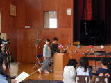 | 伴奏はピアノ・エレクトーン・小太鼓と・・・、 | ギターとハーモニカ。三重テレビの記者さんが終 始密着取材! |
