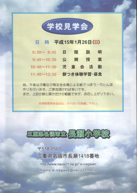 遅くなりましたが、本日橋本印刷さんより、このしおりが届きました。なお、こ のしおりは、長瀬小学校特認校推進委員会や地域の方々の、多大なご尽力 の末作成されました。皆様方のお力添えに、深く感謝申し上げます。 2003年1月17日 長瀬小学校長 森永義則 同校 職員一同 もどる