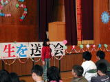 6年生入場。はじめの言葉。司会係の4・5年生。 2・3年生 劇「泣いた赤鬼」(ぺープサート)