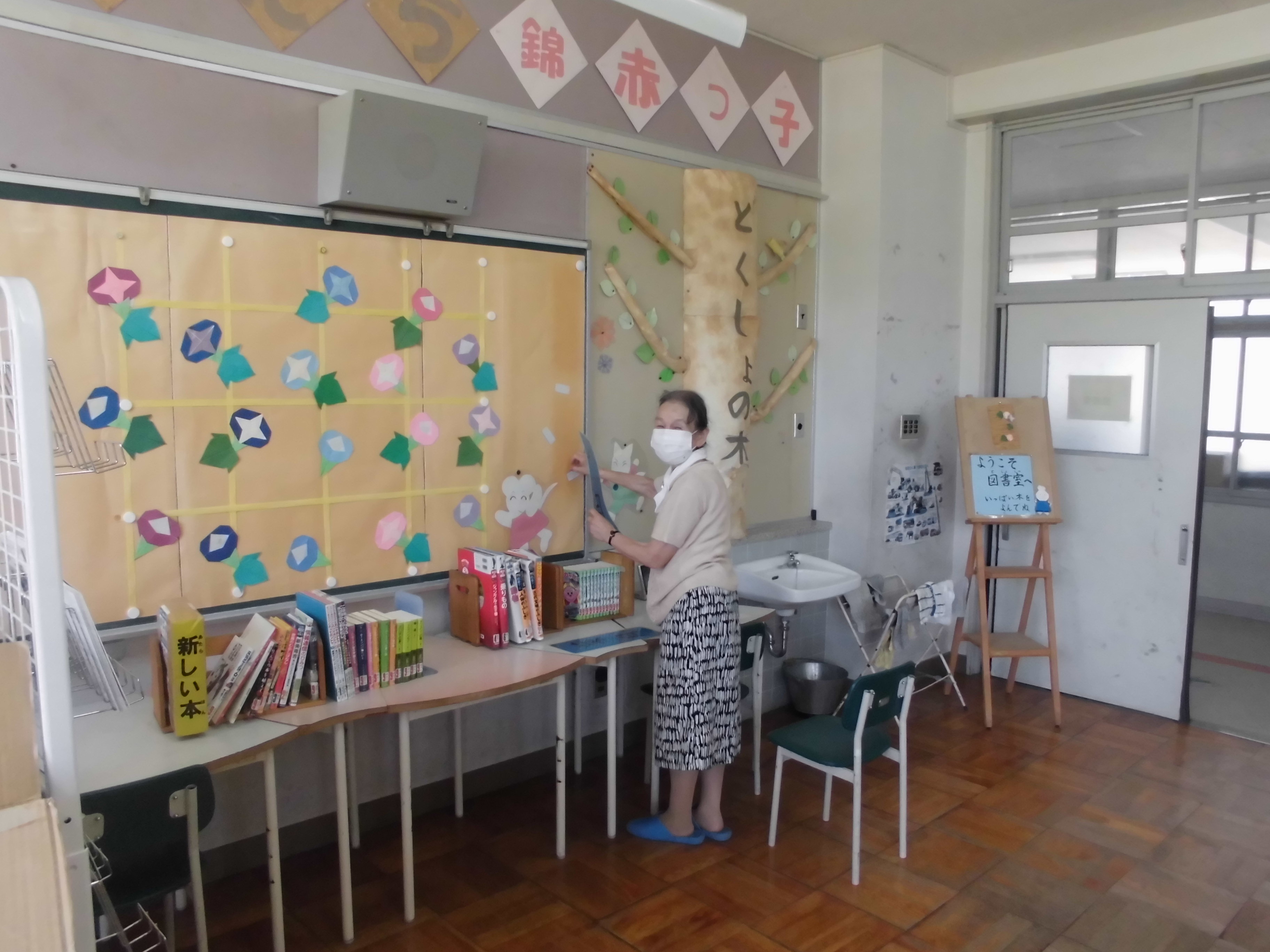猛暑が続いています。今回は夏の図書室の様子を紹介します。図書室蔵書の整備を司書の阪田さんにしていただいています。古い蔵書を整理してもらって、1部は学級文庫にもまわしてくれます。また、図書館の掲示物の張替え作業も図書ボランティアの森下さんにしていただきました。2学期からも子どもたちが気持ちよく図書室で過ごせるよう多くの方にお世話になっています。ありがとうございます。
