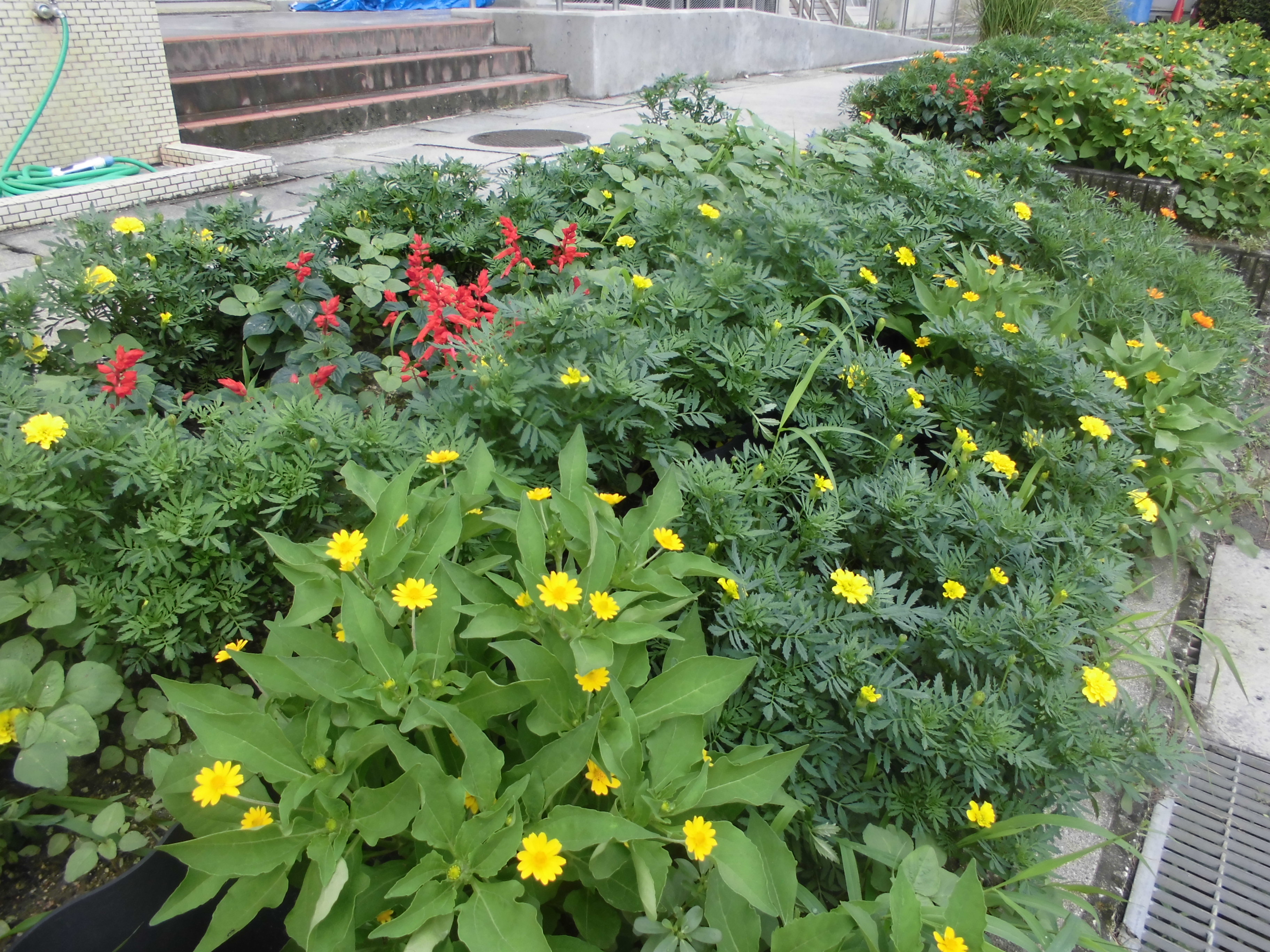 少し暑さも和らぎましたが、突然の豪雨に驚く今日この頃です。お盆も終わり、2学期開始まで10日余りとなりました。校庭の様子を紹介します。職員室前の花壇では、サルビア・マリーゴールド・メランポジウムなどが咲き誇っています。また、その隣にはアグリクラブが育てたお米の稲穂には実がたくさんついています。また向かいの学校園に目をやると、4年生のヒョウタンの実が大きくなっています。