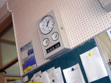 放送室の上の方にある時計です。 ほかの部屋とは違い、放送の時間を正確にするためにとても正確にくわしく作られています。 |