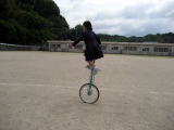 これは、滝之原小学校の玄関の前にある、大きい一輪車です。乗るのが難しいので、みんな苦労しています。 |