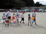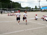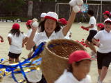 この種目は玉入れです。昨年とはルールが違って、動き回る 人が背負うかごに玉を入れます。昨年より玉が入れにくくなりました。 でもみんな楽しんでいました。 |
