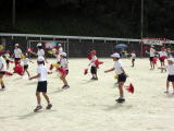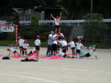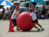 これは、大玉ころがしをしているところです。 色々障害物が多くて、意外と難しく、転んでしまう人もいました。 みんなで協力できて楽しかったです。 |