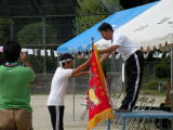 この写真は、白組が優勝して優勝旗をもらっているところです。 白組は3年ぶりの優勝となりました。 とっても思い出に残る楽しい運動会でした。 |