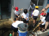 1,2,3年生はトイレやプールのまわりのそうじをしました。 草ひきやよごれているところのそうじをとってもがんばって いました。 「早くプールの中のそうじをしたいなあ。」と言っていました。 |