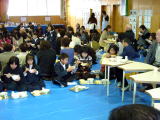 五つの班に分かれて、おうちの人や地域の方と一緒に楽しくおしゃべりをしながら、給食を食べました。 |