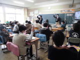 | 名張警察署から2名の方に来ていただき、「教室に不審者が入り、児童に危害を加える状況l」という設定で、職員は児童の安全確保、避難誘導など迅速かつ組織的に対応できるようにする、児童は、状況に応じて安全で適切な行動がとれるようにするというねらいのもと、不審者対応訓練を行いました。 運動場に避難した後、教室でZoomにより、名張警察署の方に防犯教室をしていただきました。低学年だけではなく、高学年も真剣に取り組んでいました。 |