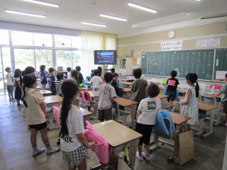 | 今日の5限目の授業の様子です。 3年2組の学活では、一人一人の相談にみんながこたえる活動をしました(輪になって、話す子はぬいぐるみをもって話し、次に話す子に渡していきます)。 5年1組の図工では浮世絵の製作をしています。タブレットで見本を見ながら、迫力のある表情の顔を集中して描いていました。 6年3組は英語でした。ALTのJeccicaと一緒に学ぶ予定でしたが、新型コロナウイルスの感染拡大に伴い、まん延防止等重点措置が適用され、ALTなどの来校は控えることとなったため、通常の英語の授業となりました。 感染された方の一日でも早い回復を願いつつ、新型コロナウイルスの感染拡大防止の取組を引き続き徹底していきます。 |