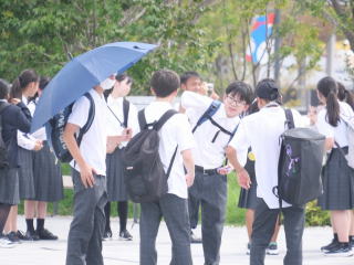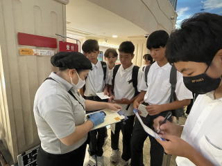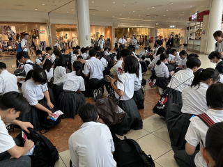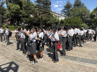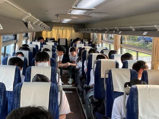1年生の校外学習で大阪・関西万博に行きました。体育館で出発式を行い、各クラスバスに乗って万博へ向かいました。車内ではビンゴ大会があり、盛り上がりました。到着後、各クラスで集合写真を撮り、子どもたちは班に分かれ、様々な国のパビリオンへ行っていました。中学校に入学して初めての校外でしたが、大きなトラブルもなく、無事に帰ってくることができました。