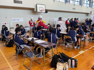 | この日は名張市総合防災訓練の日でした。各地区に分かれ、午前9時からの一時避難訓練に参加しました。生徒会本部役員と薦原小地校区生徒は、北中学校避難所開設訓練に参加し、地域の避難所運営委員会の方と共に訓練を行いました。 |