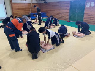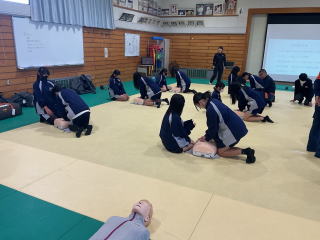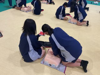 | 2年生が救急救命講習を行いました。消防署の方にきていただき、心肺蘇生の方法やAEDの使い方などを教えていただきました。今週の土曜日には防災訓練もあります。万が一に備えることが大切ですね。 |