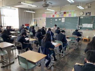 | 5・6限目に進路説明会を行いました。今年度の県立高校の出願や私立高校の受験など入試に関わる説明をさせていただきました。自分の将来に向けて、納得のいく進路選択をできるようにしましょう。 |