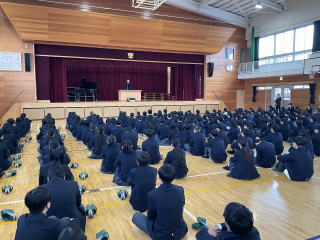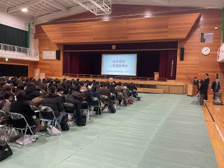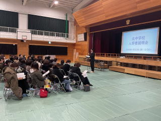 | 入学説明会がありました。2年生によるウェルカム合唱があり、素晴らしい歌声を披露してくれました。その後、学校行事や生徒心得、学習活動の説明などがありました。来年度の入学生の人たちは少し緊張した様子でしたが、一生懸命話を聞いていました。 |