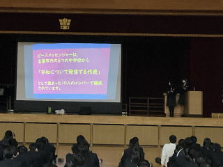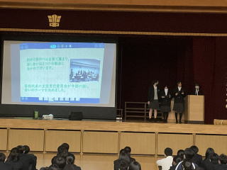 本日、始業式がありました。初めに校長先生から「心が変われば行動が変わる。行動が変われば習慣が変わる。習慣が変われば人格が変わる。人格が変われば運命が変わる」と名言を使いながら、お話ししてくれました。その後、ピースメッセンジャーとヒューマンライツから、これまでの取組みの発表がありました。 |