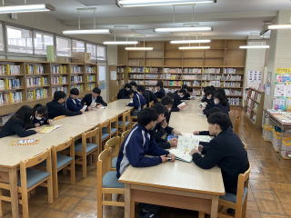 | 通常は各教室で朝の読書を行っていますが、今週は各クラス1回ずつ図書室で読書を行っています。自分の読みたい本を探し、楽しそうに読書をしていました。普段図書室にあまり行かない生徒も、、この機会に図書室の利用が増えると良いです。 |