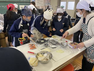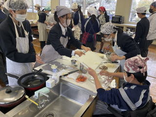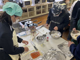 | 1年生が調理実習を行っています。今回は鮭のホイル焼きを作りました。班で協力し合いながら、スムーズに役割分担をして、上手に料理をしていました。 |