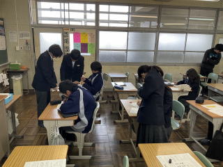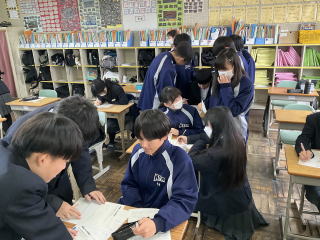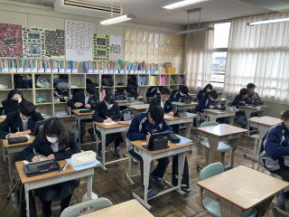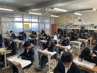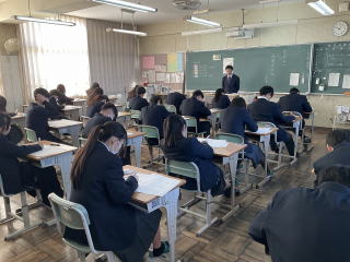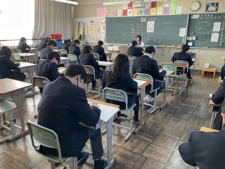 | 20日(火)、3年生は中学校最後となる定期テストの学年末テストがありました。21日(水)には実力テスト(1・2年生)がありました。日頃の勉強の成果を発揮するために、最後まであきらめない姿が見られました。 |